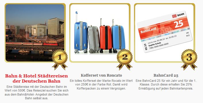Mitmachen lohnt sich: Die besten Fotos haben die Chance einen von 50 hochkarätigen Preisen zu gewinnen. Als Hauptgewinn lockt eine Bahnreise im Wert von 500 €, dafür brauchen Sie nur alle vier CEWE- Lokomotiven mit der gleichen Kamera zu fotografieren und hochzuladen. Für den zweiten Preis, ein Kofferset der Marke Roncato, müssen Sie nur drei der CEWE- Lokomotiven mit der gleichen Kamera erwischen. Der Gewinner des dritten Preises erhält eine BahnCard 25 für die 1.Klasse, dafür brauchen Sie nur je ein Foto von zwei der CEWE- Lokomotiven hochzuladen. Die Plätze elf bis 50 werden unter den Teilnehmern vergeben, die eine CEWE- Lokomotive ablichten konnten. Dabei gewinnen die Plätze vier bis zehn jeweils einen CEWE FOTOBUCH Gutschein im Wert von 50 €. Die Plätze elf bis 25 gewinnen eine CEWE FOTOBUCH Gutschein im Wert von 30 € und die Plätze 26 bis 50 ein CEWE FOTOBUCH Gutschein im Wert von 20 €.