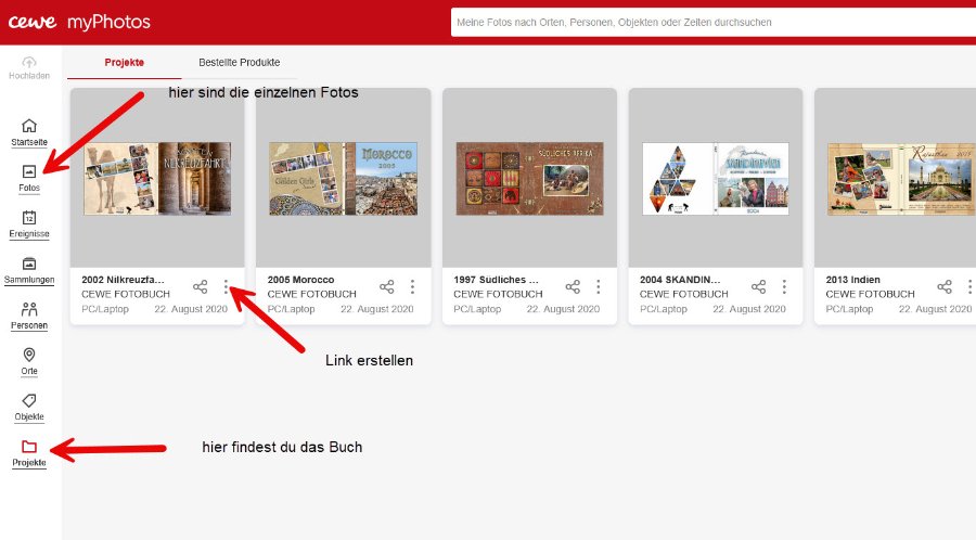 Das Erstellen des Links ist doch total einfach. Du ladest das Buch in MyPhotos hoch, unter Projekte findest du dann das Buch. Dann klickst du auf die 3 Punkte und erstellst den Link. Du kannst sogar auswählen, ob deine Freunde die Bilder runterladen dürfen, nur lesen oder du kannst es auch auf eine bestimmte Dauer freigeben. Unter Fotos sind dann die einzelnen Fotos, siehe Screenshot. Versuche es doch nochmals.