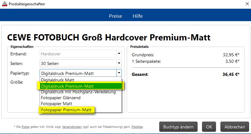 welche Papierart von dir gewählt wurde, ist ja nach dem Laden des Projektes unten rechts eindeutig ablesbar. Dort ist auch der Kaufpreis ausgewiesen. "Fotopapier Premium-Matt" ist etwa um den Faktor 1,5 teurer als "Digitaldruck Premium-Matt" (in der Abbildung unvollständigerweise als "Hardcover Premium-Matt" bezeichnet).
