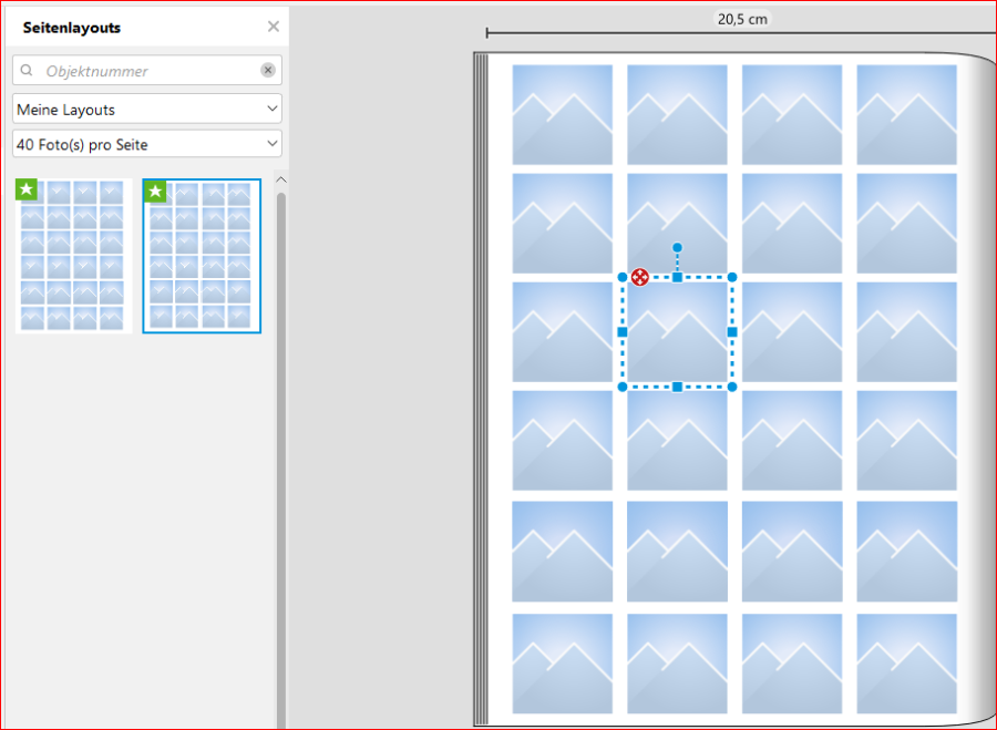 magst Du das mit den eigenen Layouts nochmals prüfen, indem Du eine der Innenseiten aufklappst (also nicht das Cover aktiv ist) und dann die Vorauswahl auf "Beliebige Anzahl Fotos pro Seite" umstellst? Dann sollten alle eigenen Layouts eigentlich auch in der V.7.2.1 vorhanden sein.