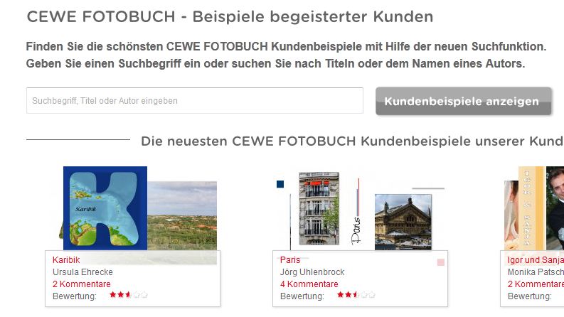 Wir laden Sie herzlich ein, die neue CEWE Community mit integriertem Forum zu entdecken und künftig zu nutzen. Das bisherige Forum, in dem Sie sich gerade befinden, steht nur noch bis Ende 2025 für neue Beiträge zur Verfügung und wird ab dem kommenden Jahr 2026 nur noch lesend zugänglich sein. Informieren und registrieren Sie sich jetzt in der neuen CEWE Community – wir freuen uns auf Sie! "Neuste Kundenbeispiele" auf der StartseiteIch habe ja nun entdeckt, dass es auf der CEWE Fotobuch-Startseite eine Rubrik "Neuste Kundenbeispiele" gibt. Ist die schon immer da? :lol: