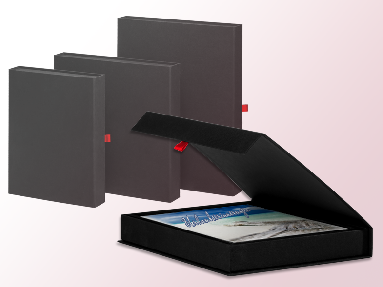 Die Geschenkbox besteht aus einem stabilen schwarzen Karton der einen schwarzen Leinenüberzug besitzt. Im Innenteil bettet sich Ihr CEWE FOTOBUCH auf einem Plastikteil mit Samtoptik. An der Seite lässt sich die Box mit einem Magneten schließen und mit Hilfe einer roten Lasche leicht wieder öffnen. Die besondere Haptik der Box bereitet vor allem beim Öffnen zusätzliche Freude und macht das Schenken zu einem besonderen Erlebnis. Durch die schlichte Optik können Sie sogar auf Geschenkpapier verzichten, da der Karton nicht über sein wertvolles Inneres verrät.