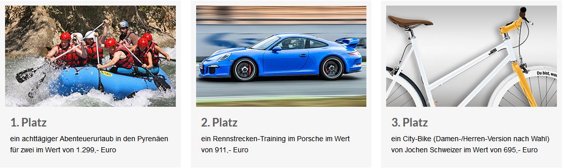 Als Hauptgewinn lockt ein achttägiger Abenteuerurlaub in den Pyrenäen für zwei im Wert von 1.299,- Euro. Der zweite Preis ist ein Rennstrecken-Training im Porsche im Wert von 911,- Euro. Als dritten Preis vergeben wir ein City-Bike (Damen-/Herren-Version nach Wahl) von Jochen Schweizer im Wert von 695,- Euro. Die Plätze 4 bis 10 gewinnen jeweils einen Gutschein von Jochen Schweizer im Wert von 150,- Euro sowie je einen Gutschein für CEWE Fotoprodukte im Wert von 50,- Euro.