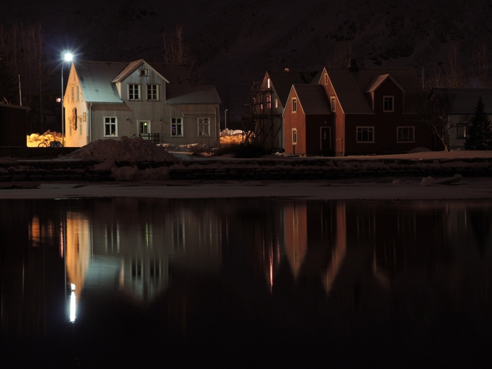 Seyðisfjörður, Island. So sehen die ankommenden Sommertouristen den kleinen Hafenort nie, weil es im Sommer dort nicht dunkel wird.