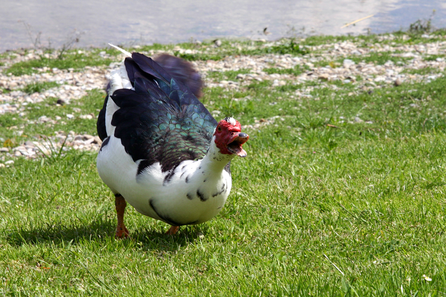 Warzenenten-Erpel bei der Revierverteidigung. Hier zieht man sich besser diskret zurück. Liebe Grüße