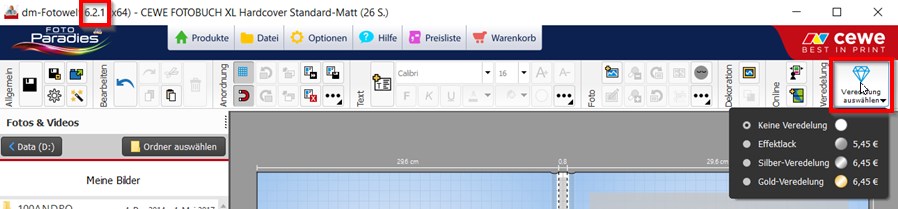 die Veredelung bzw. den Effektlack haben wir mit Version 6.2.0 eingeführt. Sie haben Ihre Bestellung vermutlich über Ihren Partner verschickt. Die Software aus dem Forum sieht fast identisch aus und mag in diesem Zusammenhang zu der Verwirrung geführt haben. Die Version Ihres Partners befindet sich derzeit im Testlauf und wird in diesem Monat zur Verfügung gestellt. Dann können Sie Ihre Projekte wieder mit dem Partner Ihrer Wahl online bestellen.