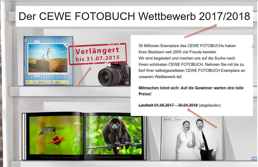 Du mußt aber vorher den Cache leeren, sonst kommst du immer wieder zum alten Wettbewerb. Eigenartig ist auch dieser Screenshot: --------------------------------------------------- Re: Galerie Fotobuch Wettbewerb 2016Danke Rotuma,