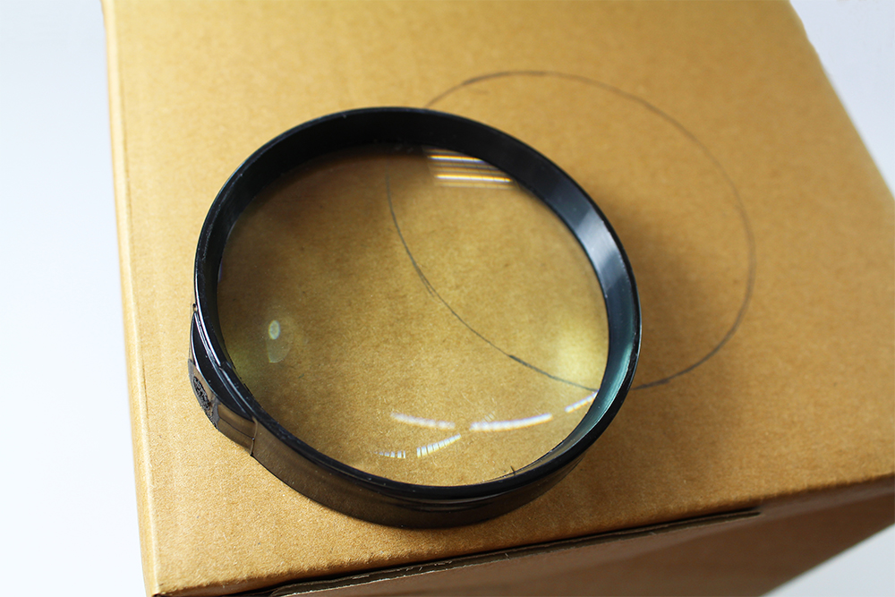 - Benutzen Sie dann das Lupenglas als Schablone und zeichnen Sie mit einem Bleistift einmal um das Glas umzu. Das spätere Loch sollte an der Vorderseite Ihres Kartons angebracht werden.