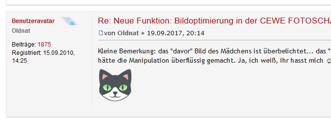 Wir laden Sie herzlich ein, die neue CEWE Community mit integriertem Forum zu entdecken und künftig zu nutzen. Das bisherige Forum, in dem Sie sich gerade befinden, steht nur noch bis Ende 2025 für neue Beiträge zur Verfügung und wird ab dem kommenden Jahr 2026 nur noch lesend zugänglich sein. Informieren und registrieren Sie sich jetzt in der neuen CEWE Community – wir freuen uns auf Sie! Re: Neue Funktion: Bildoptimierung in der CEWE FOTOSCHAUDas Kätzchen sieht bei mir auch aus wie bei Urlaubsfan! @Oldnat: Dein neues "Sonderzeichen"-Kätzchen finde ich aber viel niedlicher!