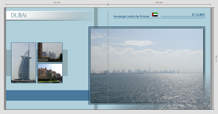 die erste Variante deiner Neugestaltung gefällt mir sehr gut. Die Farben sind wesentlich lebendiger und man hat einen anderen Eindruck von der Stadt. Um deine Informationen - Stadt, Staat, Flagge, Kartenumriss - besser einschätzen zu können, wäre es für mich nochmal wichtig zu wissen, was für eine Reise das war. War es eine Kreuzfahrt mit mehreren Ländern, wart ihr in den VAE oder nur in Dubai? Für eine Kreuzfahrt wären für mich drei Informationen ausreichend: Stadt und Land, und dann Flagge oder Kartenumriss. Bei einem Besuch mehrerer Städte in den VAE würde ich eine allgemeine Einleitungsseite dafür gestalten mit den o.g. Infos und mich dann bei den Städten auf den Städtenamen und das Datum beschränken. Evtl. noch ein Kartenumriss mit einem Punkt für die Stadt in klein oben neben dem Datum. Ich habe gerade überlegt, woran mich deine jetzige Gestaltung erinnert. An wikipedia Das Foto mit dem Wasser und der Skyline kann ich mir gut als Einzelfoto vorstellen (willst du es noch bearbeiten?). In der vorherigen, subtileren Version finde ich die Idee mit dem auslaufenden Wasser toll. Jetzt ist es mir im Vergleich zur "zarten" Skyline zu dominant, der Effekt springt einem mehr ins Auge als der Bildinhalt. Ich würde den "Auslauf" wieder etwas verkleinern. So, jetzt hab ich mal wieder viel über meine Vorlieben geschrieben. Bin gespannt, ob du welche teilst liebe Grüße