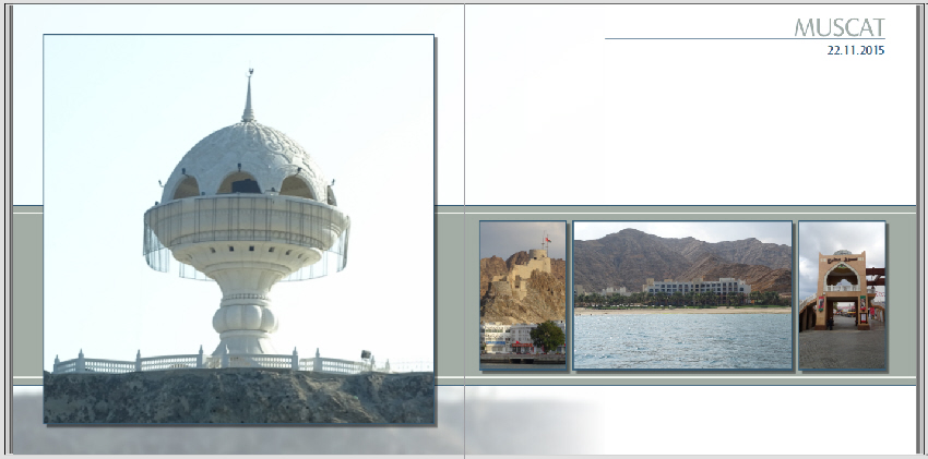 Ich persönlich finde die Schrift aber zu groß, wenn es tatsächlich auf jeder Seite erscheint. Außerdem hat man irgendwann ja mal kapiert, dass man jetzt in Dubai ist. Deshalb wäre es evtl. eine Idee, lieber hinzuschreiben, welches Gebäude, Stadtteil etc. das ist. Nur meine Gedanken dazu ... Viel Spaß weiterhin beim Gestalten. Gruß DSL-schnell