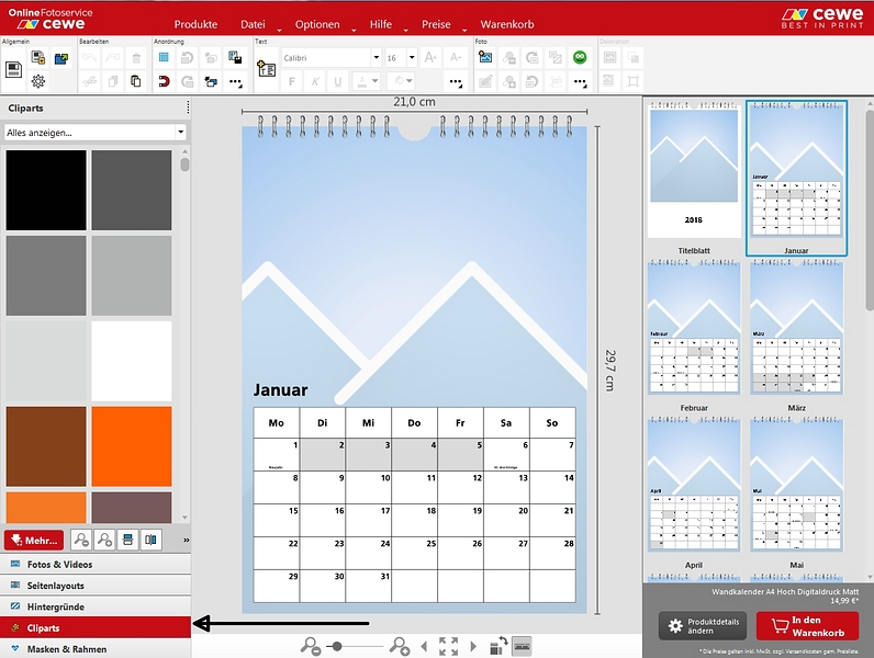 Mir ist jetzt zwischenzeitlich aufgefallen, dass mir je nach Auswahl des Grunddesigns die Clipparts angezeigt werden oder eben nicht. Das heißt, ich habe das Grunddesign jetzt geändert und mich für eins entschieden, dass mir zwar nicht ganz so gut gefällt, dafür habe ich aber die Clipparts, Rahmen etc...