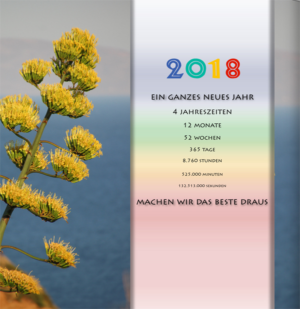 Ich stimme zu und hätte dieselbe Frage gestellt.die dezenten Farbtöne, die du gewählt hast, gefallen mir auch ausgesprochen gut, da sie sehr gut zum Hintergrund passen. Allerdings frage ich mich, ob die winterliche Stimmung repräsentativ ist für die angesprochenen 365 Tage des Jahres 2018 ? Die Texte fände ich (gerade bei der gewählten Schriftart) besser lesbar, wenn du Groß- und Kleinschrift verwenden würdest. Lieber Gruß, pitty