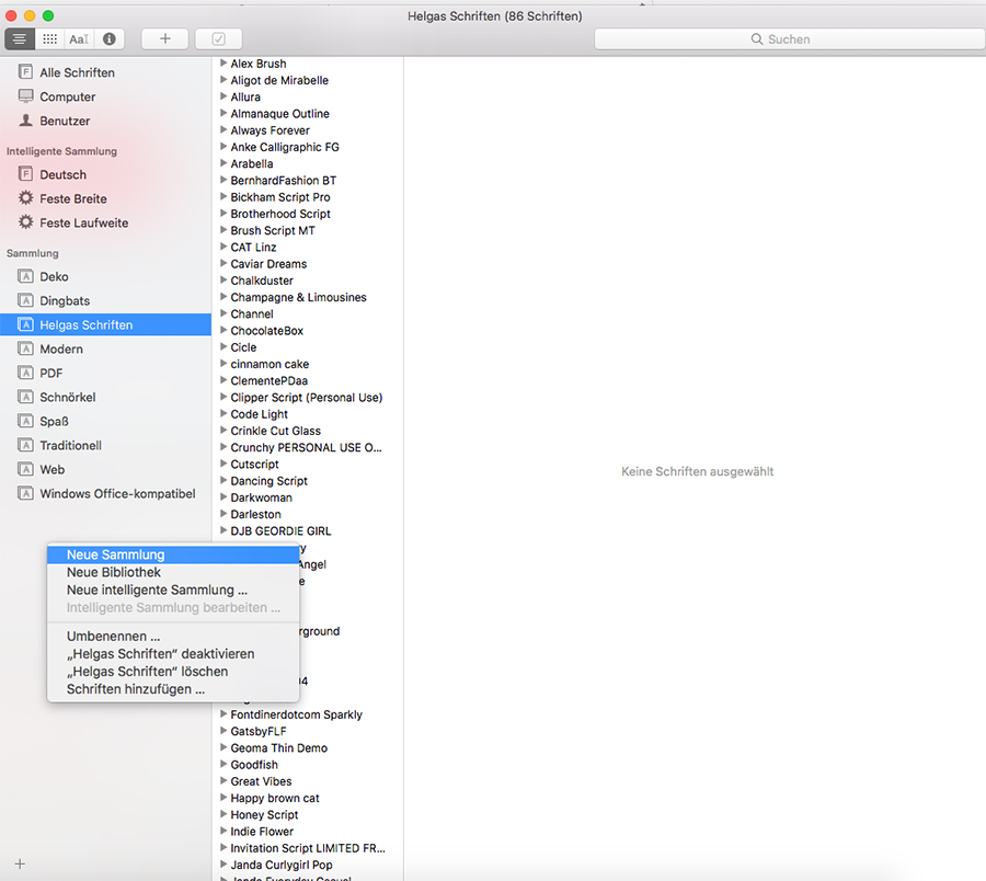 Aber der Reihe nach: ich gehöre auch zu der Spezies Sammler und Jäger. Daher habe ich mir bei meinen vielen Fonts ein paar Unterkategorien angelegt (weißt du, wie das auf dem Mac geht?):