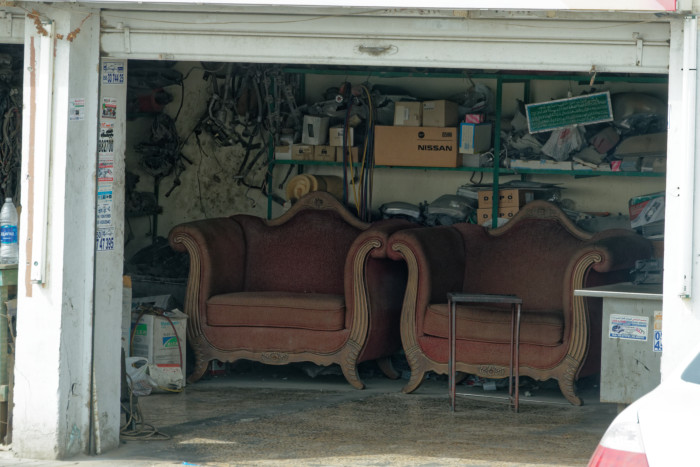 eine Autowerkstatt in den VAE, naja, ein bisschen schief, weil aus dem Auto raus fotografiert, im Vorbeifahren... da darf der Meister mit dem Kunden mal quatschen, schön bequem, und der Lehrling muss den Kaffee bringen. Viele Grüße - Gletscherfrau