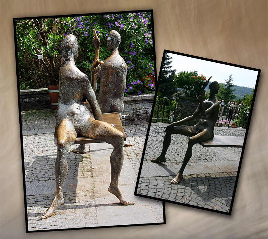 Re: Challenge 02/2018 • Sitzen gelassen!Mainau. Gute Unterhaltung von Männlein und Weiblein. Sie sitzen auf der Bank und ihre Beine sind gleichzeitig die Bankfüße. Nur gut, dass man sie dauerhaft so sitzen gelassen hat. Was würde wohl aus der Bank werden, wenn sie aufstehen?