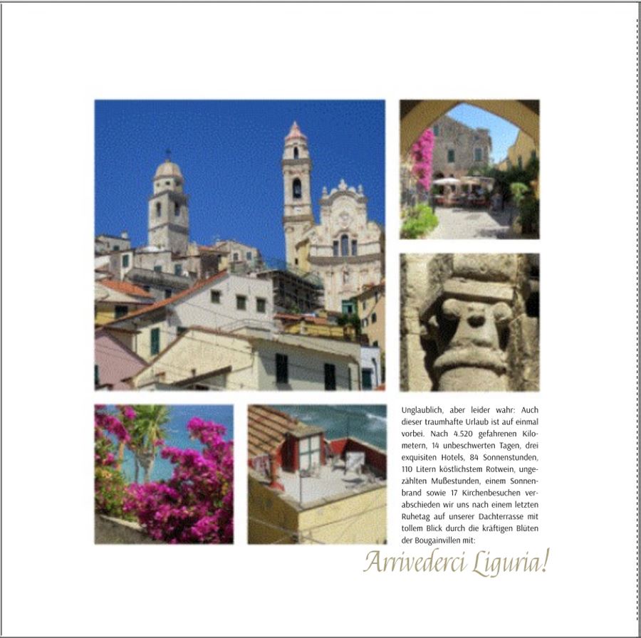 Darf ich wieder einmal um Hilfe ersuchen? Für die letzte Seite von Ligurien 1 blieb auf Grund der vorhandenen Photos nichts anderes übrig als ein Mischmasch nicht berücksichtigter Bilder aus Albenga, dem "Stützpunkt" des einwöchigen Aufenthalts. In Ligurien 2 habe ich dann das Layout "zitiert". Sollte ich es aber vielleicht analog zu Buch 1 auch mit einer gemischten Seite abschließen ("Und außerdem in Ligurien …")? Hauptproblem für mich ist aber bei beiden Seiten (bei der zweiten noch mehr als bei der ersten) die Beschriftung! HILFE! D:-?