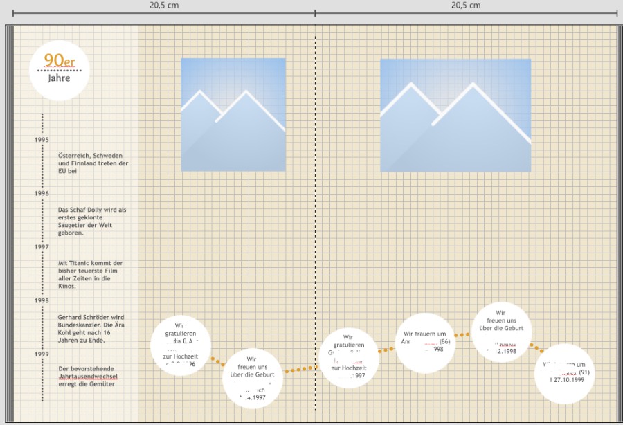 für je 5 Jahre gibt es eine Doppelseite. Ich habe links eine "allgemeine Zeitleiste" gestaltet und für jedes Jahr ein Ereigsnis eingetragen. Die Themen wechseln von Technik über Promis, Politik, Film usw. Rechts kommen dann persönliche Bilder und in den Bubbles Gebuten, Hochzeiten und Sterbefälle naher Verwandter Schrift ist Trebuchet MS in Größe 12 Buchformat ist A4, hochkant, Layflat Gruß DSL-schnell