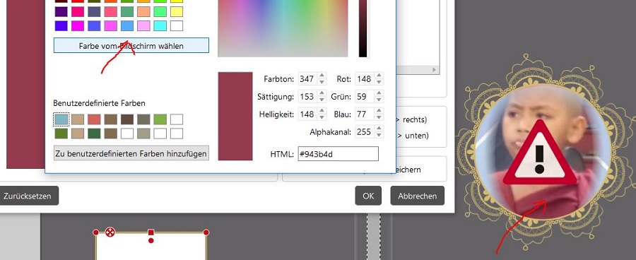 Farbquadrat doppelt anklicken, Feld "Jetzt" doppelt anklicken, anschließend "Farbe vom Bildschirm wählen" und mit dem Cursor Farbe aus der Mönchskutte picken. Dann mit ok bestätigen -> Quadrat ist umgefärbt