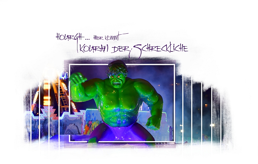Also habe ich auch diese Gestaltung versucht umzusetzen. Zwei Dinge scheinen mir wichtig: ein passendes Motiv und etwas Übung. Gestern Abend habe ich mit einem normalen Urlaubsmotiv probiert und das Ergebnis war eher langweilig. Die Gestaltung braucht Farbe und am besten Aktion oder Dynamik. Erstellt habe ich es mithilfe einer Maske - natürlich im Bildbearbeitungsprogramm, nicht in der CEWE-Softwware. Das heißt, ich habe meiner Bild-Ebene eine weiße Ebenenmaske (Begriffe sind aus gimp) hinzugefügt und diese "bemalt". Das Masken-Prinzip ist ja: weiß ist sichtbar, schwarz ist transparent, grau oder s/w mit verringerter Deckkraft ist semitransparent. Ich habe die seitlichen Streifen mit schwarzen schmalen Strichen unterteilt. Für das Verlaufende von oben bzw. außenrum habe ich mit verschiedenen Pinseln experimentiert. Den Rahmen habe ich auf einer neuen Ebene angelegt und ihn mithilfe einer Ebenenmaske an verschiedenen Stellen unterbrochen. Einen Schatten habe ich mir, ebenfalls auf einer neuen Ebene, mit schwarzen Strichen, die ich weichgezeichnet habe, gemalt - ebenfalls mit Maske, damit ich ihn an den Stellen, an denen ich den Rahmen entfernt habe, ebenfalls transparent machen kann. Theoretisch könnte man bei Rahmen und Schatten auch radieren. Ich mache es aber lieber mit Maske, weil ich dann einfacher korrigieren kann, wenn mir was nicht gefällt. So sieht es aus: