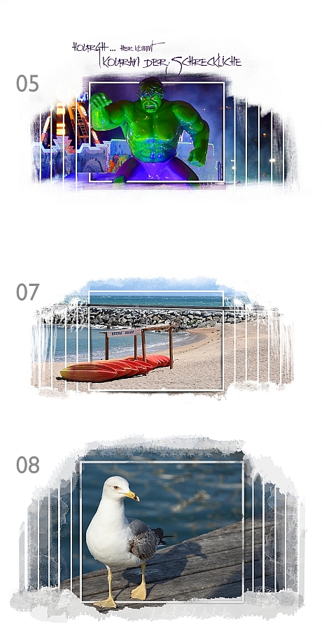 Also habe ich auch diese Gestaltung versucht umzusetzen. Zwei Dinge scheinen mir wichtig: ein passendes Motiv und etwas Übung. Gestern Abend habe ich mit einem normalen Urlaubsmotiv probiert und das Ergebnis war eher langweilig. Die Gestaltung braucht Farbe und am besten Aktion oder Dynamik. Erstellt habe ich es mithilfe einer Maske - natürlich im Bildbearbeitungsprogramm, nicht in der CEWE-Softwware. Das heißt, ich habe meiner Bild-Ebene eine weiße Ebenenmaske (Begriffe sind aus gimp) hinzugefügt und diese "bemalt". Das Masken-Prinzip ist ja: weiß ist sichtbar, schwarz ist transparent, grau oder s/w mit verringerter Deckkraft ist semitransparent. Ich habe die seitlichen Streifen mit schwarzen schmalen Strichen unterteilt. Für das Verlaufende von oben bzw. außenrum habe ich mit verschiedenen Pinseln experimentiert. Den Rahmen habe ich auf einer neuen Ebene angelegt und ihn mithilfe einer Ebenenmaske an verschiedenen Stellen unterbrochen. Einen Schatten habe ich mir, ebenfalls auf einer neuen Ebene, mit schwarzen Strichen, die ich weichgezeichnet habe, gemalt - ebenfalls mit Maske, damit ich ihn an den Stellen, an denen ich den Rahmen entfernt habe, ebenfalls transparent machen kann. Theoretisch könnte man bei Rahmen und Schatten auch radieren. Ich mache es aber lieber mit Maske, weil ich dann einfacher korrigieren kann, wenn mir was nicht gefällt. So sieht es aus: