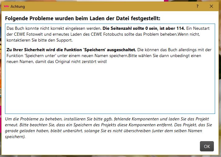 Wenn ich auf den Button "Zum Cewe Fotobuch" klicke, gibt es die Fehlermeldung "....keine Rückmeldung" oder nach langer Zeit erneut den Willkommensbildschirm. Bei diesem beginnt bei >Projekt neu oder Projekt öffnen< wieder der Kreislauf.