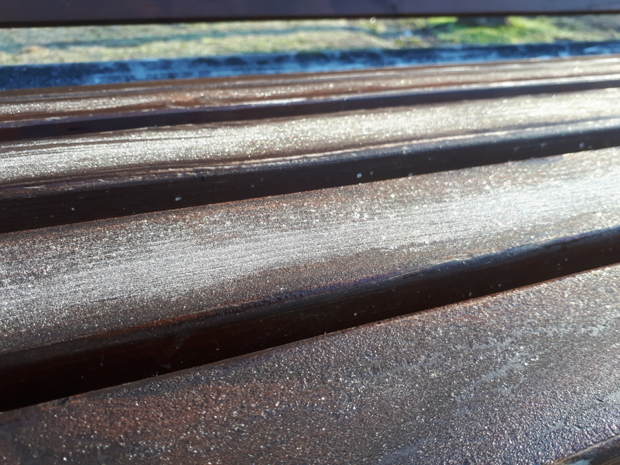 Raureif auf einer Bank am Wegesrand: Liebe Grüße