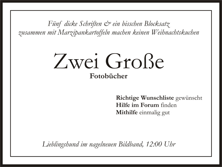 Ich sehe bei den Kundenbeispielen viele Bücher, in denen zu große Schriften eingesetzt werden. Faustregel: Der Betrachtungsabstand bestimmt die Schriftgröße! Eure Arme werden nicht länger, nur dadurch, dass Ihr ein XXXXL-Format ausgewählt habt. Und andersherum sollte ein kleines Buch Euch nicht dazu verleiten, eine zu kleine Größe zu wählen, sodass Ihr (oder Eure Oma) eine Lupe zur Hand nehmen muss.