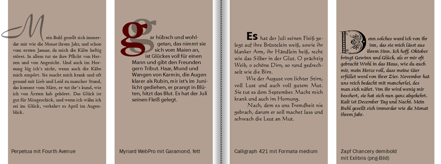 Wer viel Text im Buch hat und diesen gliedern möchte oder wer einen Akzent auf einer Seite setzen möchte, kann dafür Initialen in einer besonderen Schrift verwenden.