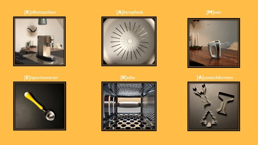 Re: 29. November | Kategorie: FotografieDas Wort "Kamera" gebastelt mit Gegenständen aus der Küche :-)