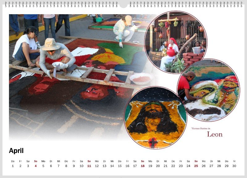 Re: 12. Dezember | Kategorie: KreativesEin Kalender mit Bildern unserer Reise nach Nicaragua. San Carlos ganz im Süden ist eine Partnerstadt von Nürnberg. In Leon waren wir in der Karwoche, der Semana Santa. Am Freitag legen die Bewohner dort auf den Straßen farbenprächtige Bilder mit biblischen Motiven aus bunten Sägespänen, den Alfombras, "Teppichen". Nach Einbruch der Dunkelheit zieht dann die Prozession darüber und die Pracht ist dahin.