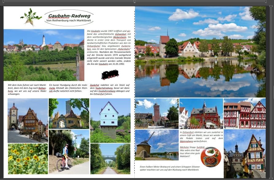 nachdem ihr mir so toll mit dm Inhaltsverzeichnis meines Radlermagazins geholfen habt, hier die Rohentwürfe einiger Innenseiten. Zufrieden bin ich noch nicht...Mittlerweile aber auch vollkommen betriebsblind und mir fällt gar nichts ein... Bei der Seite "Saale 3" hab ich jetzt erst mal kapituliert, die linke Seite finde ich soweit ok, der Text fehlt noch, aber bei der rechten Seite vom Ziel Naumburg weiß ich gar nicht weiter, zumal ich auch keine weiteren Fotos davon habe, es war schon recht spät abends als wir dort ankamen und zum Fotografieren war das Licht nicht mehr optimal. Danke schon mal! Re: Radelbuch - InnenseitenHallo Reisetante,