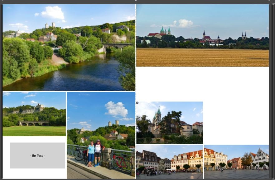 nachdem ihr mir so toll mit dm Inhaltsverzeichnis meines Radlermagazins geholfen habt, hier die Rohentwürfe einiger Innenseiten. Zufrieden bin ich noch nicht...Mittlerweile aber auch vollkommen betriebsblind und mir fällt gar nichts ein... Bei der Seite "Saale 3" hab ich jetzt erst mal kapituliert, die linke Seite finde ich soweit ok, der Text fehlt noch, aber bei der rechten Seite vom Ziel Naumburg weiß ich gar nicht weiter, zumal ich auch keine weiteren Fotos davon habe, es war schon recht spät abends als wir dort ankamen und zum Fotografieren war das Licht nicht mehr optimal. Danke schon mal! Re: Radelbuch - InnenseitenHallo Reisetante,