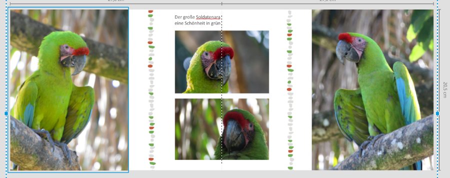 Hallo Xxpetra,wozu genau möchtest Du eine Meinung haben ? Ich persönlich glaube, dass die Schrift etwas groß und "mächtig" ist. Die Farbtupfer-Reihen gefallen mir. Insbesondere bei den Papageien. Allerdings würde ich sie generell nicht zuuuuu häufig verwenden. ggf. auch nur eine pro Doppelseite. Auf der "Essens-Seite" finde ich sie etwas zu viel. Wahrscheinlich hast Du "Layflat" als Layout gewählt. Trotzdem würde ich den Bruch nicht genau durch wesentliche Bildteile laufen lassen und z.B. versuchen das obere Papagei-Gesicht etwas zu schieben. Soweit mein Eindruck. Gruß DSL-schnell