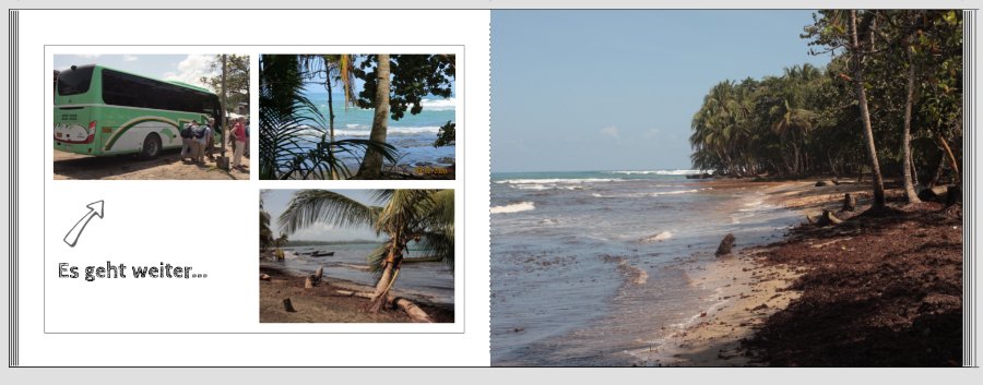 Schön, dass du uns deine Seiten anvertraust Deine Fotos wecken bei mir schon wieder Fernweh, Costa Rica stand eigentlich auch auf meiner Liste. Was mir ganz allgemein auffällt: Du liebst alle deine Fotos und kannst dich nicht entscheiden. Auf den meisten Seiten sind viele sehr ähnliche Fotos. Dies führt dazu, dass sie sich gegenseitig Konkurrenz machen. Das Auge des Betrachters kann sich nicht entscheiden, wohin es schauen soll. Besonders auffallend ist dies bei den Bildern der Reisegruppe im Lokal, aber auch bei den Farnen. Entscheide dich für die besten Fotos und lasse diese dann wirken, evtl. auch mithilfe von ein paar Dretailaufnahmen oder eine Freistellung oder mit schönen Verläufen, Rahmen usw. Auf jeden Fall nicht ähnliches Bild an Bild. Die Schriften erscheinen mir sehr groß. Drucke vielleicht mal eine Seite aus, dann siehst du, wie wuchtig die Schrift ist, am Bildschirm wirkt das immer anders. Ich habe diesen Fehler jahrelang gemacht. "es geht weiter" kann man machen, aber zusammen mit dem Pfeil würde ich es eher auf die rechte Hälfte der Doppelseite setzen, denn es inspiriert zum Weiterblättern. Wenne es nur auf den Bus bezogen ist, ist der Pfeil irreführend. Du scheinst keine längeren Texte zu haben, dann lass es lieber ganz. Das es "schön" ist, das sieht man, das muss man nicht schreiben. Die Seite mit der Landkarte und den Punkten der Reise finde ich ganz gut, allerdings scheinen es mehr Punkte zu sein als dann rechts erklärt werden - kann das sein? Ich würde auch zu jedem Punkt nur ein Foto nehmen, später im Buch kommt dann ja mehr. Bei San Jose ist 2 x ein identisches Bild. Sicher Start und Ziel, aber das macht trotzdem keinen Sinn. So, ich hoffe du nimmst mir die Kritik nicht übel, es ist gut gemeint. Ich habe hier selbst schon so viel Hilfe bekommen und weiß, dass man nur so lernt. Also ran ans Werk Re: Bitte um eure MeinungHallo Petra,