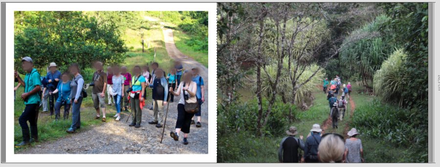 Seite 1 gefällt mir Seite 2 gefällt mir der Pfeil überhaupt nicht, und der Satz, es geht weiter, erschließt sich eventuell aus den vorangegangenen Seiten oder den folgenden? Ansonsten würde ich ihn eher weglassen. Seite 3 jemand hat angemerkt, dort seien zu viele gleiche Fotos. Ich finde, das kommt immer darauf an, ob es dieselben Personen sind. Bei einer Busreise kann ja schon eine größere Anzahl zusammen kommen. Und wenn dann immer verschiedene Personen zu sehen sind, dann finde ich die Seite sehr schön. Bei Seite 4 wiederum gefällt mir überhaupt nicht, dass so viele gleichartige Fotos zu sehen sind. Hättest du für diesen Bereich noch 1 oder 2 Fotos mit Detailaufnahmen aus dem Dschungel? Ich denke, das würde das ganze auflockern. So sieht es wirklich etwas langweilig aus. Und der Streifen ist zu dominant, wurde aber ja schon geschrieben. Seite 5 gefällt mir sehr gut. Jemand hatte geschrieben, dass es schöner wäre, die Fotocollage Links und rechts gleich groß zu machen. Man könnte auch den zweiten Clipartstreifen rechts neben die Colibricollage setzen und auf der rechten Seite die ganze Collage, ohne clipartstreifen, größer ziehen. Bei den Sätzen würde ich die drei Pünktchen nicht direkt an das letzte/erste Wort setzen, sondern mit einem Leerzeichen dazwischen. Den Teilsatz „und andere hübsche Vögel“ könntest du auch rechtsbündig setzen. Und insgesamt die Schrift etwas kleiner. Seite 6 gefällt mir. Seite 7 gefällt mir, bis auch den Text, auch. Der sieht ein bisschen sehr hingeklatscht aus. Du könntest probieren, ob der untere Satz auf der rechten Seite Platz hat. „Der große Soldatenara - eine Schönheit in grün“ auf einer Linie. Liebe Grüße