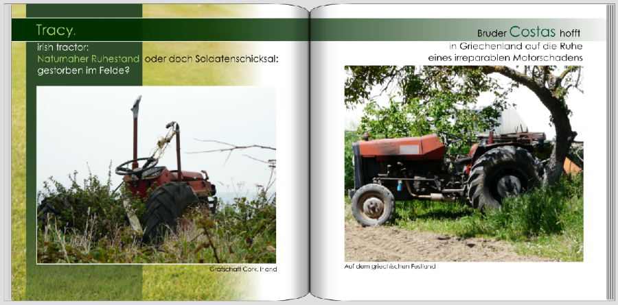 Die Idee, zu den Bildern noch Text zu schreiben, finde ich sehr schön. Jedoch würde ich nicht Dreierlei ausgestalten. Auf Deiner gezeigten Doppelseite wollen drei Dinge in den Fokus: Die Bilder im Vergleich, der Text mit Inhalt und Design, und auch der Hintergrund drängt sich eher in den Vordergrund. Ich würde wohl nur Bilder oder Text in den Fokus rücken und das andere der beiden dezent gestalten. Auf einen augenfälligen Hintergrund würde ich wohl ganz verzichten. Ein Beispiel, was mir dazu in den Sinn gekommen ist, ist dieses: Fundstücke. Hier stehen die Fotos im Fokus, sind dennoch sparsam inszeniert. Und die Texte, trotzdem sie länger sind, unterstreichen in ihrer Gestaltung die Bilder, ohne ihnen die Wirkung zu nehmen. In dieser Richtung könnte ich mir auch Dein Memory-Buch mit der hintersinnigen Textplanung vorstellen. Natürlich in Deinem eigenen Stil. D:)
