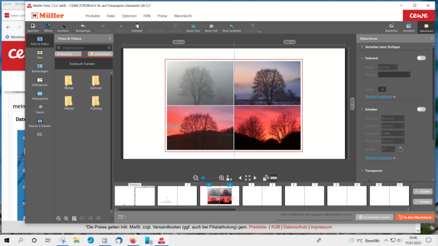 Für alle, Dir hier ggf. später nachlesen, ergänze ich gern noch einen Screenshot.Der Weg dorthin: Beliebiges Foto in der CEWE Fotoschau öffnen, dort Farbeffekte --> Transparenz auswählen, Regler auf 100% schieben, mit OK bestätigen und unter neuem Namen abspeichern. Mein transparentes Bild ist 3000x3000 Pixel groß. Das reicht aus, damit kein Warndreieck meine Gestaltung stört. Die Software erkennt halt nicht, dass die Pixel farblos sind. Liebe Grüße