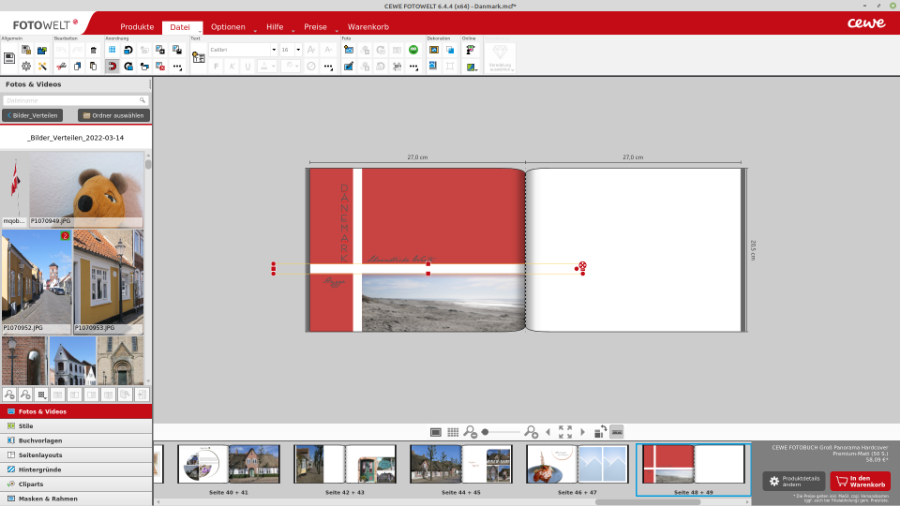 Hallo, ich kann mich nicht entscheiden, welche Entwürfe ich nehmen soll und würde mich über Eure Meinungen freuen. Beim Titel "Dänemark" vertikal untereinander geschrieben oder die gedrehte Form. Welches Foto findet ihr passender? Gestaltung nur in Anlehnung an Flagge, zentrierter Querstrich gefiel mir nicht so gut. Mit der linken Seite der Kapiteleinleitung bin ich eigentlich ganz zufrieden. Rechte Seite ganzflächig oder kleiner und mit rundem Clipart hinterlegen- um die Form aufzunehmen? Oder auch runde Gestaltung - die gefällt mir eigentlich am wenigsten. Die restlichen Seiten sind eher schlicht mit Freistellungen und einigen Transparenzen. Bin diesmal ziemlich unsicher, vielleicht können mich eure Anregungen ja in die richtige Richtung schubsen. Oh je - jetzt scheitere ich schon am Einfügen der Seiten. Beim Versuch die Entwürfe rein zu ziehen entweder Meldung, dass zu groß oder es wird nur ein kryptischer Pfad angezeigt. Könnt Ihr mir bitte helfen. Dank - jetzt hat das Einfügen geklappt! LG wulle Re: Eure Meinung zu Titel / KapiteleinleitungHallo Wulle,