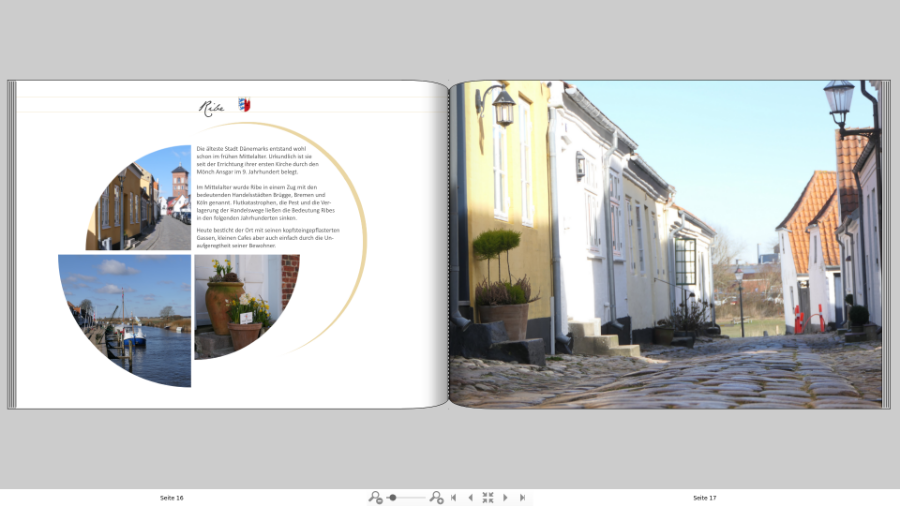 beim Cover sehe ich es genauso wie Spica: Die asymmetrische Fahne hat mich etwas irritiert, also wenn schon Fahne, dann richtig. Mit dem Bild im rechten unteren Rechteck kann ich mich so gar nicht anfreunden, erst recht nicht, wenn das Rot im oberen Bereich durchschimmert. Willst Du es vielleicht mal ohne Bild probieren und dafür die Texte "Dänemark", "Unendliche Weite" und "Hygge" etwas grösser und auffälliger schreiben? Ist die Rückseite mit der Wortwolke schon fertig? Mit so wenigen Begriffen ist es eine recht dünne Schleierwolke, sozusagen. Vielleicht fallen Dir ja noch mehr Schlagwörter aus dem Urlaub ein. Bei der Seitengestaltung gefällt mir die letzte Doppelseite mit Abstand am besten. Dass rechts ein farblich passender transparenter Kreis hinter dem Foto die runde Gestaltung der linken Seite aufnimmt, sieht sehr harmonisch aus. Ich denke, damit bist Du auch am flexibelsten. Wenn Du bei einer Kapiteleinleitung mal kein passendes Foto im Querformat hast, kannst Du auch 2 im Hochformat nebeneinander oder ein quadratisches nehmen. Viele Grüsse