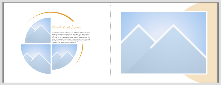 Re: Eure Meinung zu Titel / KapiteleinleitungMit Kunigundes Anmerkung zum rechts stets wiederkehrenden farbigen Kreis und Asiafans Hinweis auf die Textgestaltung/-platzierung habe ich mal an dem Grundlayout gebastelt. Ich empfinde es als sehr große Herausforderung, Texte so halbrund anzupassen, dass es am Ende wirklich harmonisch aussieht. Aus reiner Faulheit würde ich mich dieser Herausforderung nicht stellen