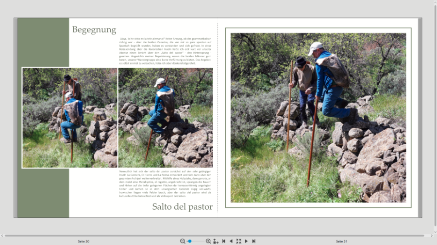 vielen Dank für Eure Einschätzungen. Ja, ich habe mich inzwischen entschlossen, auf mehreren Seiten eine dekorative Schriftart einzusetzen. Die Seite Hirtensprung ist vermutlich neben der Einleitung die einzige Seite, bei der ich sehr viel Text haben werde, die Wandertouren selbst geben textmäßig nicht ganz so viel her. Ich habe Euch, damit es Euch nicht langweilig wird, eine weitere Seite zur Diskussion vorbereitet. Freue mich wie immer auf Eure Einschätzungen und Tipps. Die blühendne Landschaften setze ich noch ein bißchen höher, das hab ich gerade erst gesehen. Und nicht wundern, wenn ich unter der Woche nicht so im Forum bin, muss den ganzen Tag beruflich am Computer arbeiten, da wollen die Augen abends nichts mehr sehen... Einen schönen Abend! Re: Hilfe bei Gran Canaria gesuchtHallo Reisetante,