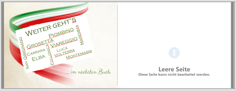 Zum Cover: Ich finde die Schriften leider weiterhin zu dominant, aber am Ende soll es Dir gefallen. Mir würde aus Deinen beiden vorgestellten Varianten eine Mischung am besten gefallen. "Toskana" nicht zwei- sondern einfarbig und der Rahmen von Variante 2. Kannst Du das Bild im Rahmen noch etwas nach unten verschieben? Jetzt enden die Zypressen genau oben am Rahmen. Der Grünton von der Rückseite gefällt mir besser als der Braunton. Falls Du den Farbton verwenden möchtest, den ich genutzt habe, kann ich gerne mal RGB- oder HTML-Code der Farbe hier posten.