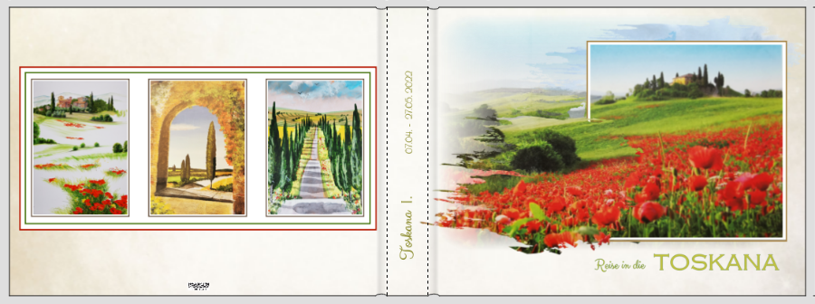 Auch das Unterwegs in der Toskana finde ich zu groß. Ich würde die Schrift so verkleinern, dass es an der Unterkante des Fotos endet.