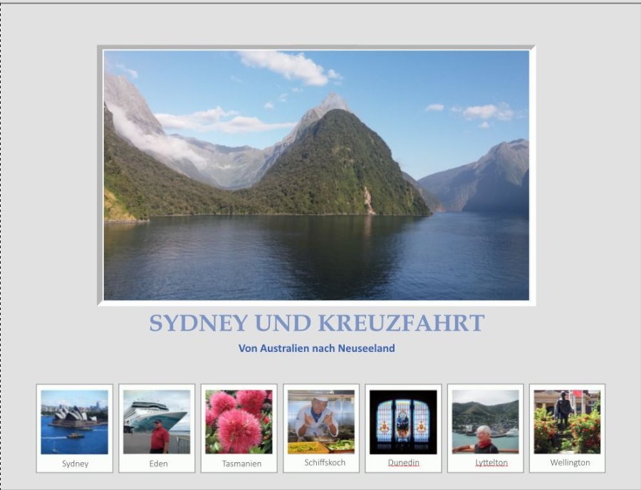 Bei den Bildunterschriften würde ich noch mittig ausrichten. Bis auf Sydney und Dunedin haben alle Texte einen "Rechtsdrall". PS: Ich habe vorhin neue(?) "fertige" Rahmen in der CEWE-Software gesehen, die Deinem Wunsch nahekommen. Ich sehe später nochmals nach den Objektnummern und poste sie hier. Liebe Grüße