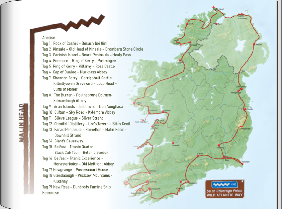 1. Erste Seite: Auf jeden Fall soll da die Karte mit dem Routenverlauf, die Stationen in Textform und das Zeichen des Wild Atlantic Way drauf, aber ob ich auch noch das Schild unterbringen soll oder wird das zuviel, was meint Ihr?