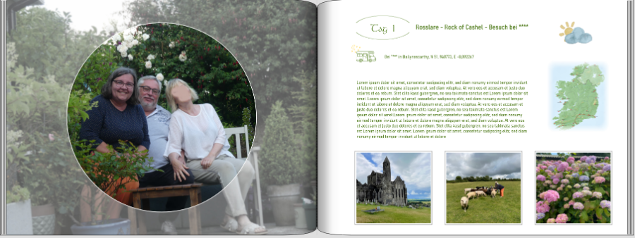 endlich habe ich mit dem Fotobuch von unserem Irland-Urlaub im Sommer angefangen. Da wir eine Rundreise um die ganze Insel gemacht haben, will ich das Buch erstmals will in Tagebuchform gestalten. Bei ein paar Details schwanke ich noch.