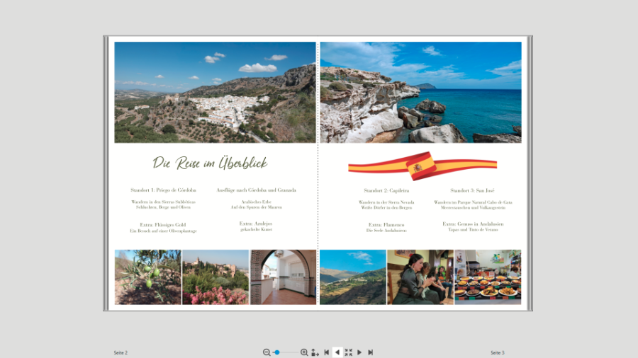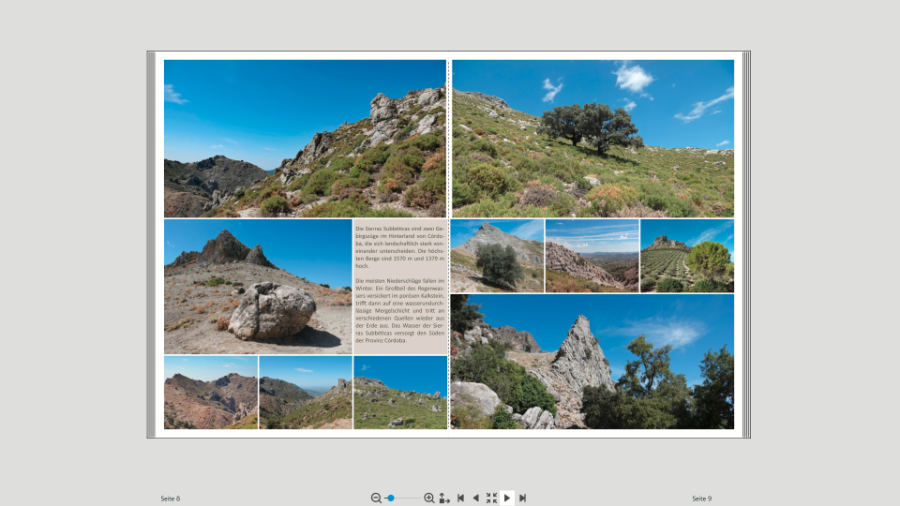 Die Abstände sind exakt gleich, ich habe die Fotos so platziert, dass die Warnung "zu nah am Rand" kommt, das müsste unten und oben identisch sein. Und auch am falz sind sie genau ausgerichtet sagt mein Bildschirmlineal. Vielleicht eine optische Täuschung?Traumfänger hat geschrieben: Was ich aber sehe, hat für mich mit Magazin nicht viel zu tun. Ich möchte auch kein Buch im Stil einer Fraun- oder Fernsehzeitschrift gestalten, sondern hatte eher Geo oder National Geographic im Sinn, da sind ja weniger Formen und wild durcheinander platzierte Fotos auf den Seiten. Allerdings habe ich festgestellt, dass ich für diese Idee der Gestaltung schlichtweg zu wenig Text habe. Bei den Wanderungen gibt es nichts weiter zu schreiben und auch bei den restlichen Touren nicht, ich war schon mal in Andalusien, damals die klassische Reise mit mehr Kultur und demzufolge mehr Text. Mal sehen, hab auch schon in meinem Standard-Format XL probiert, aber da hab ich auch noch keine guten Ideen. Der Winter ist ja zum Glück lang, nass und dunkel...Re: MagazinstilReisetante hat geschrieben: