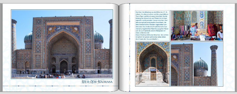 Mit meinem neuen Projekt bin ich so auf Halbzeit. Genug, um sich ein paar Gedanken zu machen, ob es passt oder nicht. Irgendwie hänge ich grad wieder fest. Selbst ist man ja nun schon soweit im Buch, dass es nicht schadet, wenn mal ein paar neutrale Augen auf das Werk schauen. Mein Stil soll nach wie vor eher klar bleiben, das Land (Usbekistan) gibt aber schon etwas mehr her. Ich habe nun extern einen Hintergrund gefunden, der zum Baustil passt. Ist das zu dominant? Ich habe immer mal wieder Verlaufsmasken drauf gelegt. Die Farben des Landes sind alle Blau-Töre und viel Gold, je nach Region aber auch Lehm. Was will ich ausdrücken? Die Schönheit des Landes und der Gebäude. Aber natürlich auch unsere persönlichen Erlebnisse. Die Textfelder sind unterchiedlich, ob Bericht oder Information. Die Infos will ich wieder als Blocksatz machen, das mache ich aber erst, wenn die Gestaltung steht. Auf einer Seite habe ich mal probiert, ob goldenen Farbränder oder auch Farbfelder evtl. gefälliger sind als das Blau, hab da etwas ausprobiert. Ich bin gespannt, ob ich durch euch wieder in die Spur komme. LG und schon mal vielen Dank Monika