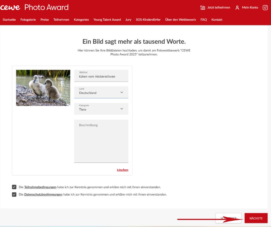 Re: CEWE Photo Award 2025 "Our world is beautiful"Ich lade die Fotos meistens mit dem originalen Dateinamen hoch, im zweiten Schritt, also auf der nächsten Seite, wird der Titel angegeben und das Land und die Kategorie gewählt. Die Bilddaten werden automatisch erfasst, wenn sie in der Bilddatei enthalten sind.